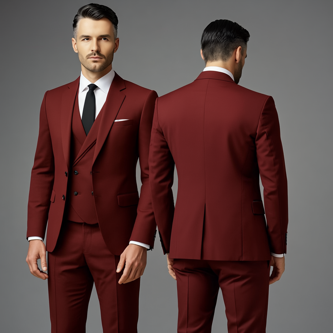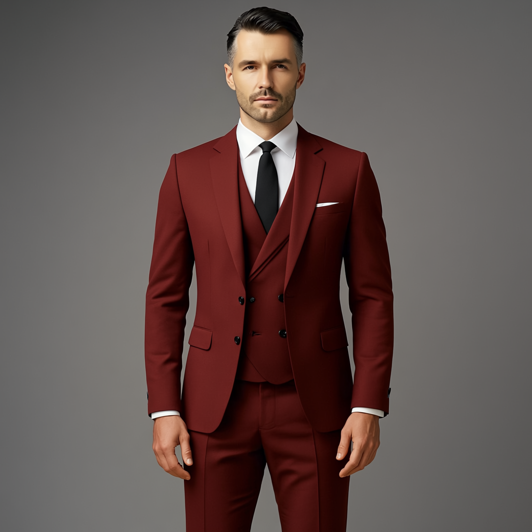 Denne dressen leveres som et tredelt sett bestående av jakke, vest og bukse. Jakken har klassisk slag, knappelukking og påsydde lommer som gir et strukturert preg. Vesten har knapperekke foran og fremhever helheten med et ryddig uttrykk. Buksen har beltehemper og et rett snitt som gir en balansert silhuett. Detaljene og sømmene fremstår som presise og godt utført.